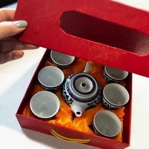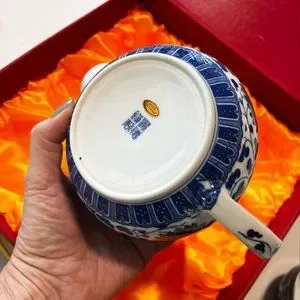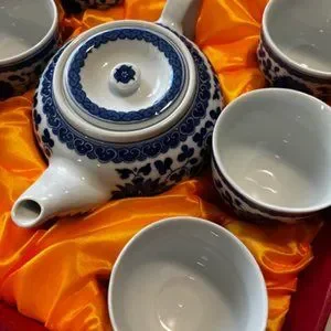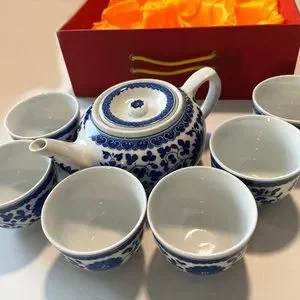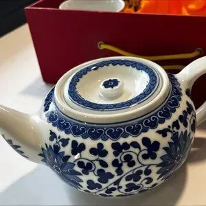 Vintage Chinese Teapot/Six Teacups in Display Case, Blue & White, Perfect Condition! Only $59!