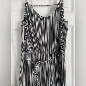 Soft, textured material with lining in the bodice. The low back has a pretty strap across, and there’s a skinny self-tie belt.
