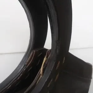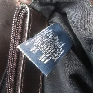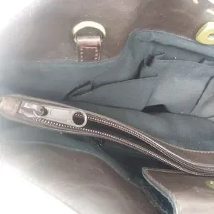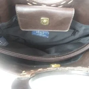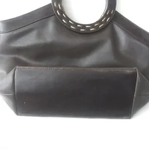 Vintage Liz Claiborne Crazy Horse round-handle purse. Dark brown faux leather with contrast stitching on handles. Pebbled body with smooth trim top of bag. Zippered exterior pocket on back. Interior has magnetic snap closure. Zippered middle compartment with open compartments on either side. Interior divided slip pocket and zippered pocket. Rings inside to attach a longer strap if desired.