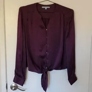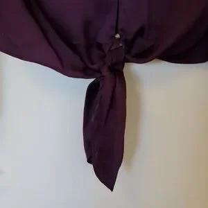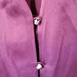 beautiful deep eggplant color purple long sleeve silk top with bottom tie detail. silver buttons with loop closure.