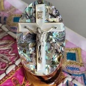 Jesus On Cross With Abalone Background. Made In Holy Land. 4" Tall 2"Wide.