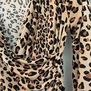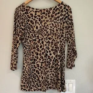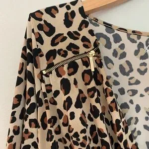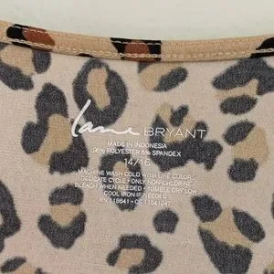 Lane Bryant stretchy leopard print crossover top with zipper detail. Soft stretchy fabric 95% poly 5% spandex. Three-quarter sleeve. Decorative gold zippers. Gathered on one side. Chest measured flat underarm to underarm 20”. Arm length 17”. Length shoulder to hem 25-1/2”. Like-new condition. Five-star seller, fast shipper, nonsmoking home.