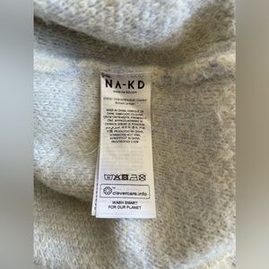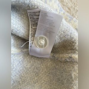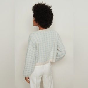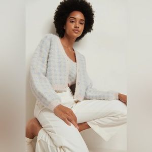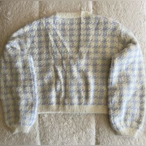 Super soft eyelash knit cardigan in an oversized herringbone check print. Cropped silhouette. Blouson sleeve. 3 buttons at center.
