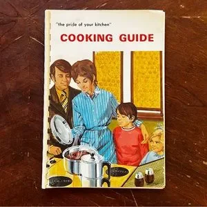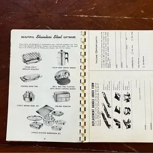 VINTAGE Vollrath Stainless Steel Cookware cooking guide and cookbook. 4 pages of information about the cookware including cooking and cleaning. “Recipes courtesy of American Dairy Association from the new cookbook Modern Approach to Eyeryday Cooking. There is a beef chart, overall cooking tips, a page with photos of the cookware, and on the inside back cover, a copy of the 50 year Warranty.