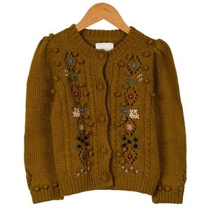 Very rare! Worn only 2x. DÔEN's feminine 'Forget-Me-Not' cardigan - hand-embroidered flowers, pointless insets and puffed sleeves. It's cable-knitted from soft organic cotton and wool-blend and fastens with hand-crocheted covered buttons.