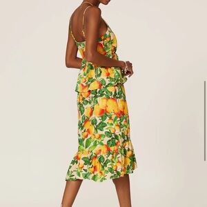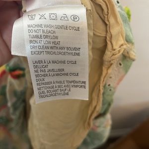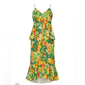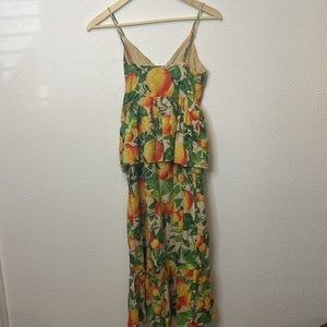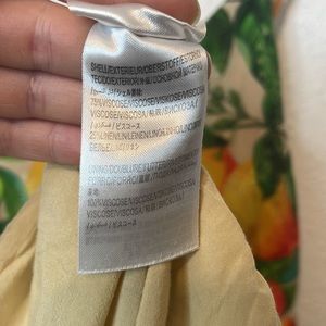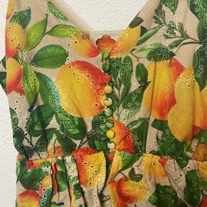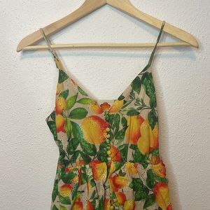 Green and yellow printed crepe (70% Viscose, 30% Linen). Hourglass. Sleeveless. V-neckline. Hidden side zipper with hook-and-eye closure. Fully lined. 48" from shoulder to hemline