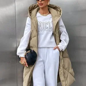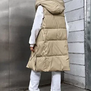 Khaki Casual Womens Pocket Zip Up Hooded Puffer Vest Coat