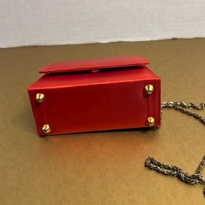 Just in time for holiday parties, this red, satin-like mini bag will go everywhere you want to shine! 5” high, 5.5” wide, 2” depth at base. Magnetic envelope close, 1 small inner pocket. Shoulder chain has a 22” hang for shoulder or crossbody carry. Chain is not removable, but will tuck inside if you prefer hand-carry. Used once…but oh, how it made a difference!