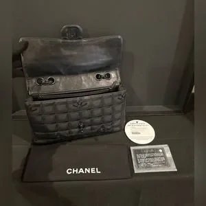 Chanel New Travel Line Chain Shoulder Bag Black Nylon Jacquard Leather Women's