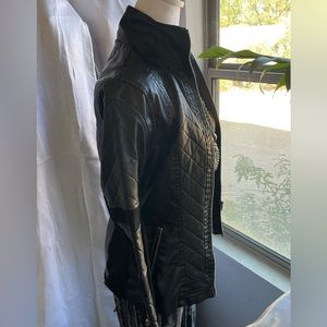 Faux leather jacket with sheer panels on sleeves. Zipper works well. Biker fit. All clothing can be purchased from closet when adding to a bundle. Accessories not included
