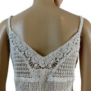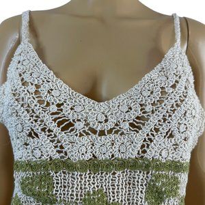Women Boho Blouse Crop Top Crochet Small Ivory Green Hem Fringe Sleeveless V-Nec