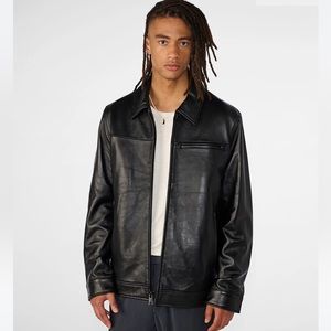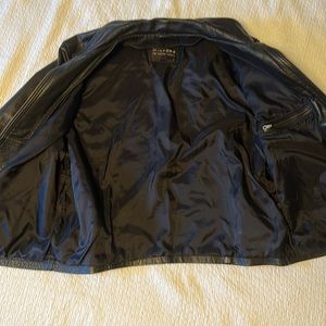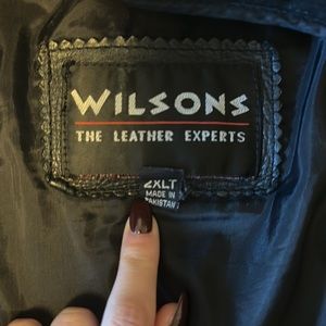 Genuine black high quality leather jacket from Wilsons Leather, the leather experts. Functional front pockets plus chest pocket, adjustable buckles at sides, and lined. Size is 2XLT. EUC.