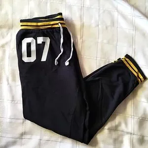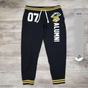 Pre-loved, Harry Potter Hogwarts Alumni Joggers w/ school crest & 07 vinyl print. Draw string waistband & two front pockets. Minor fading or other signs or wear might be present.