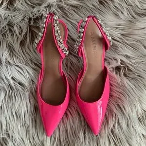 Aminah Abdul Jillil Soleil crystal embellished patent leather slingback heels in Barbie (neon pink color)