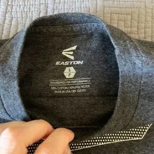 Dark gray color is more of a cotton fabric, and has the Easton "E" on the chest and logo on the arm sleeve. The black and red are the sport-tech material, blank fronts, with logo on the back and arm sleeve.