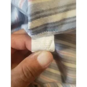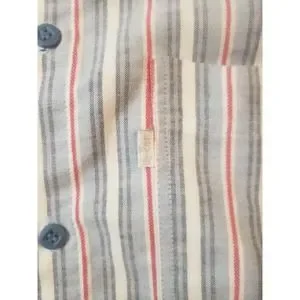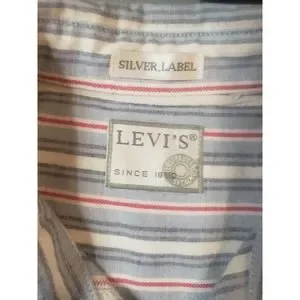 Vintage Levi's Silver Label red white and blue stripe button up shirt. Shirt was manufactured in 1987 according to the tag, see pics. Size tag is missing so I based size off the measurements, see below. Only flaw is missing bottom button. Otherwise shirt is in excellent condition with no stains, holes, loose threads or frayed edges. #24