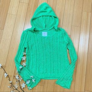 Justice super soft and snuggly bright green neon sweater with hood , size 14. Pre-loved and there is one small snag at the neckline. Very minor. Bust measures 19 inches across, length 21.5 inches, sleeve 25 inches. Very soft and not scratchy at all. Tiny metallic threads give this sweater just a little bit of shimmer and sparkle. Color best represented in the close-up photo of the tag.