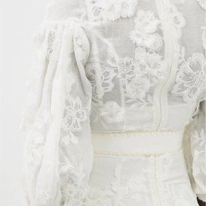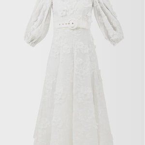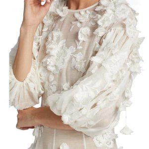 Zimmermann's Postcard dress is framed with a roundneck and voluminous billowy sleeves. Cinched with a whipstitched waist belt, this lightweight sheer dress is designed with intricate three-dimensional floral embroidery and miniature rings.