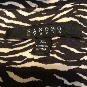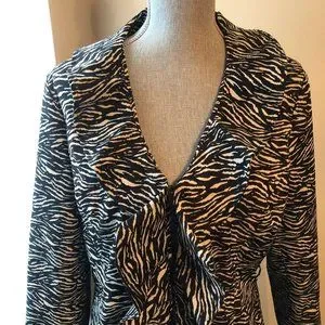 Sandro Animal Print Ruffle Front Jacket. Pointed collar. Ruffled front. Hook closure. Deep v-neckline. Fully lined. Black and white in color. Excellent condition. No rips, tears, or stains. Bust is 22 inches. 29 inches tall. 100% polyester.