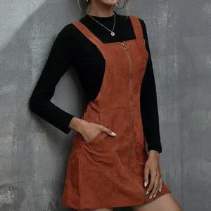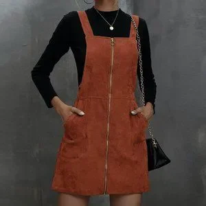 Rust Brown Casual Womens Corduroy O-Ring Zipper Mini Overall Dress