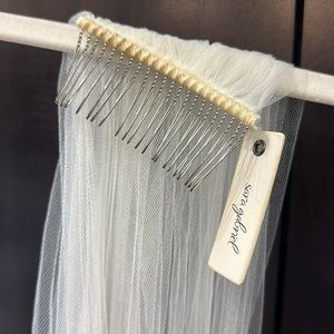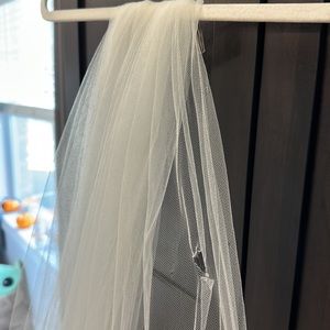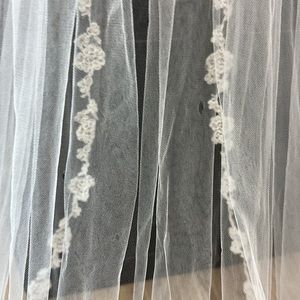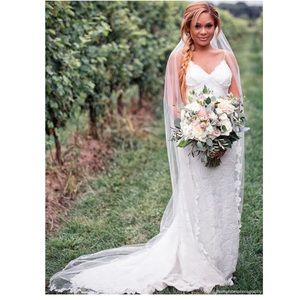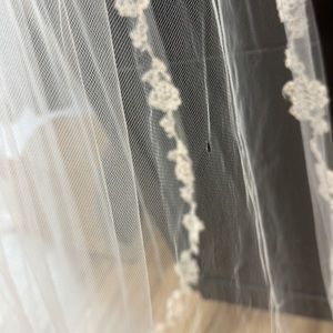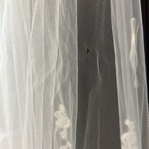 Purchased from a wedding dress store sample sale with several tears as seen in photos. If you can fix them, it’s a beautiful veil!