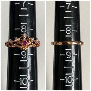 Size 8.5. Rose gold plated princess crown style ring. Faux pink sapphire showcased at the center of the crown with clear CZ crystals. Stamped 925 / 18k GP. Rose gold plated copper.