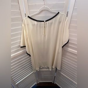 This is a 6X. The biggest I can list is a 5X. Cream colored blouse with black sequins around the neck and arms. Keyhole back with a button closure. Chiffon material. Please see all pictures and ask any questions before purchasing.