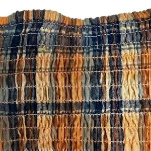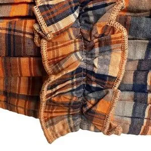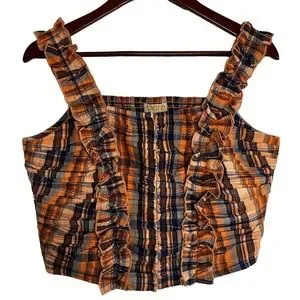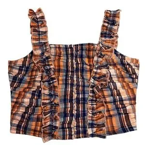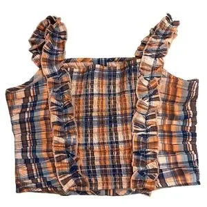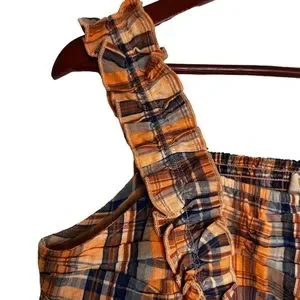Ruffled Plaid Tank Top Smocked in Orange, hook and clasp closure down the front, ruffle straps with some stretch.