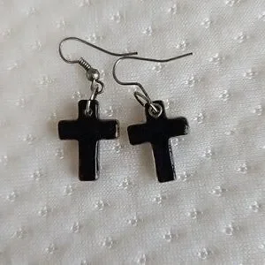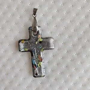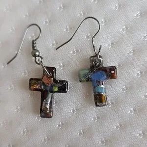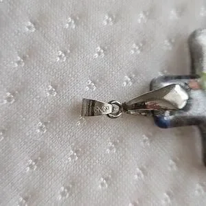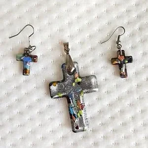 Early 2000s vintage silver colored cross pendant with a splash of color and matching earrings. The pendant fixture is 18k Gold plated as well (see picture for the hallmark)