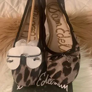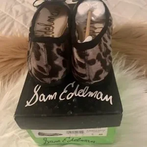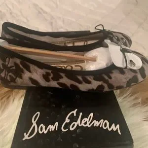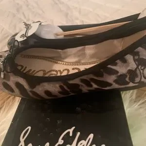 SAM EDELMAN FELICIA GREY LEOPARD FLAT SHOE, SIZE 5, NEW IN BOX.