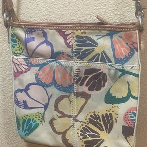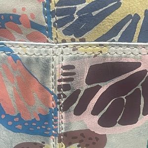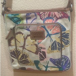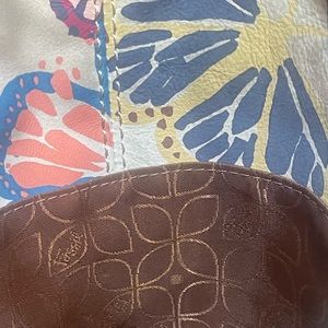 Elevate your everyday style with this stunning Fossil Key shoulder bag. The multicolored leather trim and coated floral fabric create a colorful and eye-catching exterior, while the cotton and leather lining ensure durability and comfort. The adjustable crossbody strap and zipper closure make it practical for everyday use, and the interior features one pocket and one zipper for organization. This medium-sized bag is perfect for casual-missing the key. Has scuff on the part that rest on the body