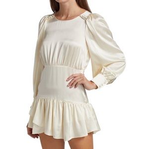 Swishy silk charmeuse minidress features button shoulder blouson-style sleeves with tailored button cuffs, gathered at dropped waist and tiered ruffle hem for a playful look.