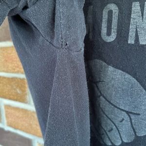 Used T-Shirt. The designs are light because once upon a time they were coated in reflective ink. There is a tiny hole in one of the arm pits.
