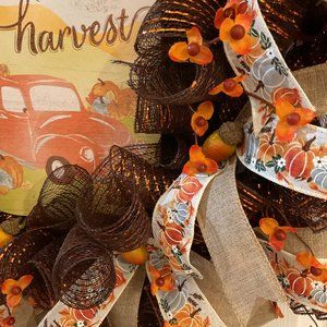 Fall deco mesh wreath with sign; embellished with floral, ribbon and acorns