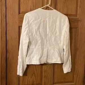 This blazer is very lightweight. It’s in good condition. It can really dress up an outfit. Would look great with jeans and heels or a nice pair of slacks