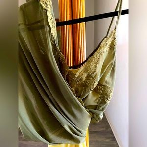 The contrast of the lining and the unique green tulle outer layer gives this dress a gorgeous shimmer. Soft lace at neckline and hem create a beautiful feminine look.