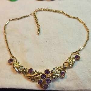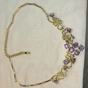 Beautiful gold tone Coro necklace with purple rhinestones and a hook clasp. Measures 16 1/2".