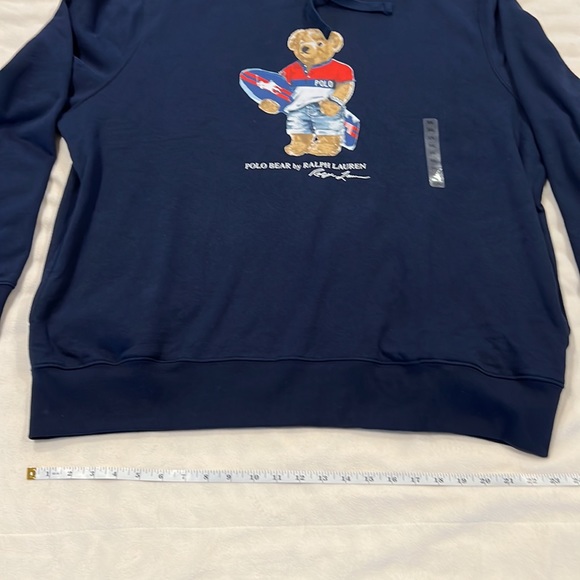 Brand new, never worn with tags still on. Rich navy blue drawstring hoodie with red, white and blue dressed polo bear carrying a surf board. Pocket on each side along the seam. Ribbed waist and cuffs on sleeves.