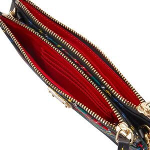 Two outside zip pockets. One inside zip pocket. One inside slip pocket. Three credit card slots. Adjustable strap. Removable strap. Strap drop length 24". Lined. Zipper closure. Item Dimensions: H 5" x W 0.50" x L 8"
