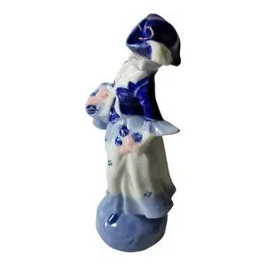 Vintage Blue & White Figurine Victorian Lady in Colonial Dress, W/ Basket of Flowers Occupied Japan.