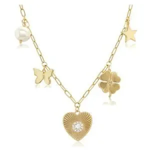 Pearl, Butterfly, CZ Clover, Heart, & Star Charm Chain Necklace