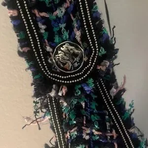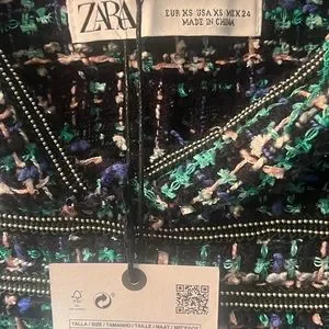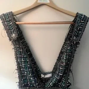 Zara green/black/pink and blue midi tweed overall dress. Silver buttons and beaded detailing.