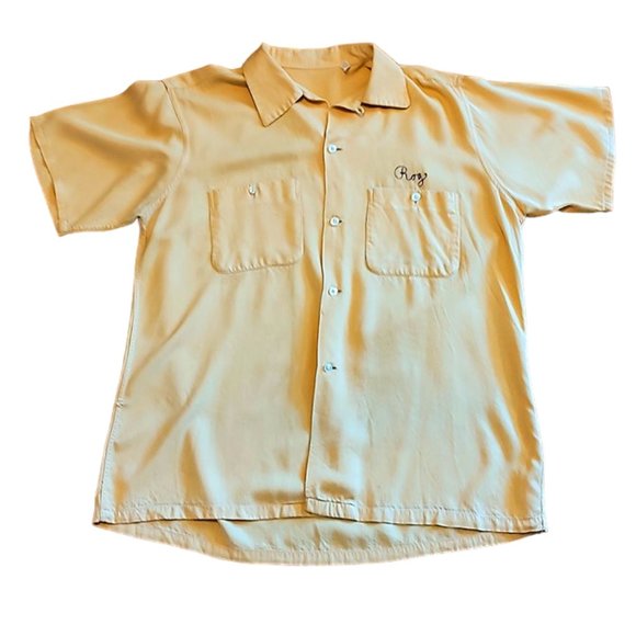 A true vintage 1950s yellow rayon short sleeved bowling shirt with the owners name and flocked team name.
