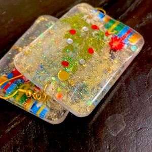 XMAS Handmade Large Pressed Flower Holiday Earrings Christmas Tree Rectangle