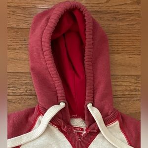 This is a very well made short sleeved hoodie, which was made to look and feel vintage. The hoodie features a notched collar, ribbed trim and has a kangaroo front pocket.
