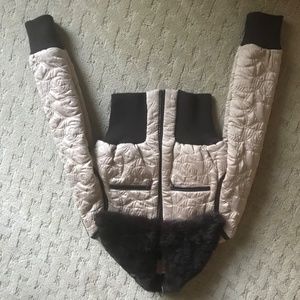 Authentic bebe fur collar jacket. Fur on collar is removable. Brown leather trim. Good condition.