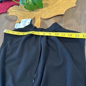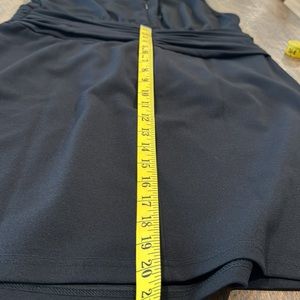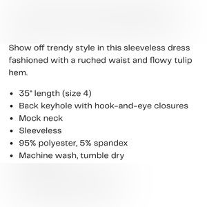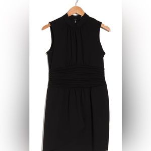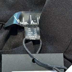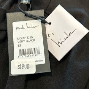 NWT. The perfect little black dress. Nicole Miller ladies size 12. 95/5% polyester/spandex blend. Keyhole back, ruched waist and a tulip hem. Sleeveless with a mock neckline. Approx measurements are 14” across the shoulder, 17” armpit to armpit, 27” at waist and 20” waist to bottom of skirt.