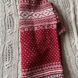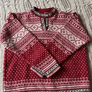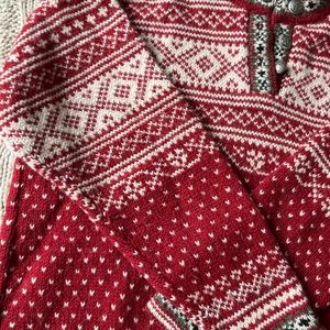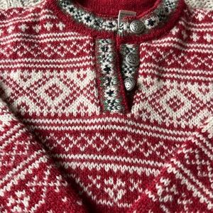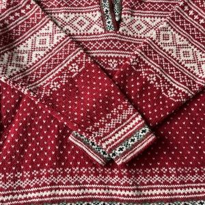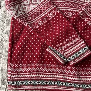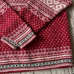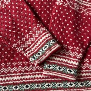 The sweater is pre-owned but in excellent condition. It comes in a beautiful red, beige, and green color combination that is sure to make a statement. Whether you're running errands or going out for a night on the town, this LL Bean sweater is the perfect choice.