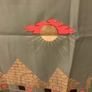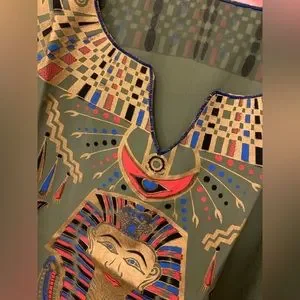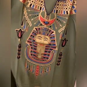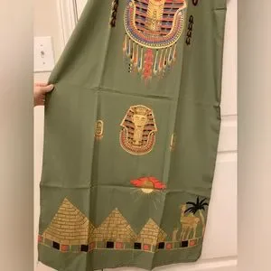Has gold printed King Tut, camels, pyramids, hieroglyphics, and eye design.