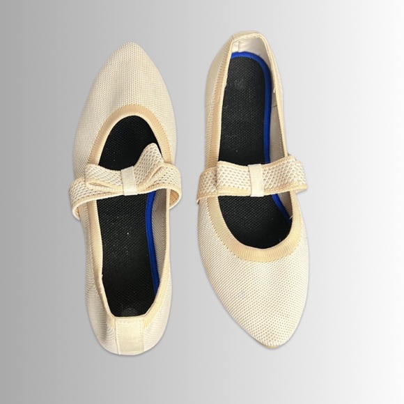 Rothy’s Style Off White Slip on Shoes, Top Bow, Adjustable Strap, Size 41. The trim is a cream color and flats have a tiny .25” heel. Toes are slightly pointed and sole is flexible for a comfortable fit!